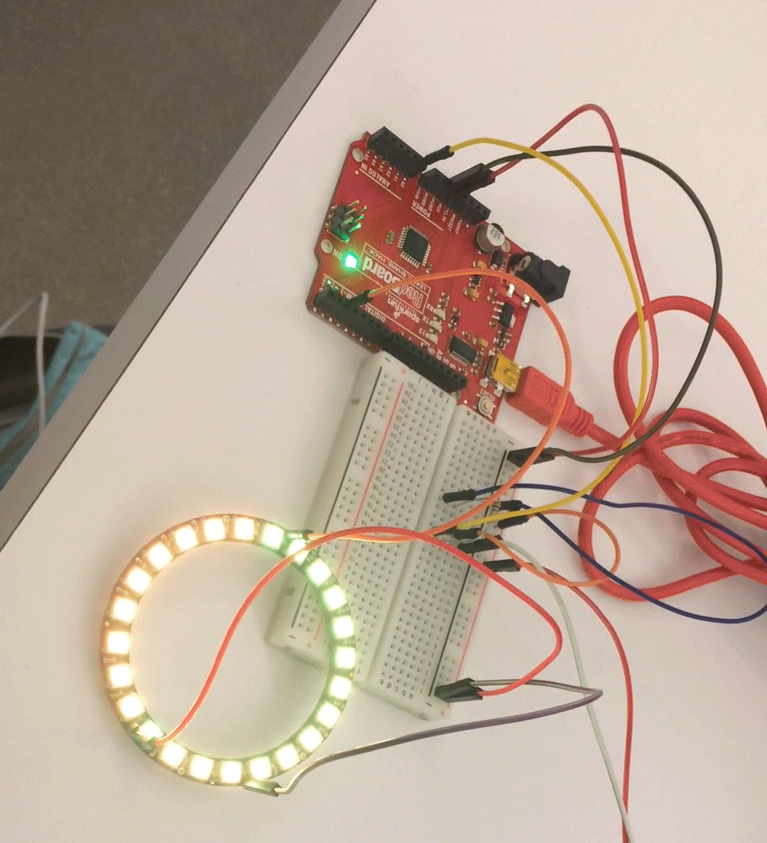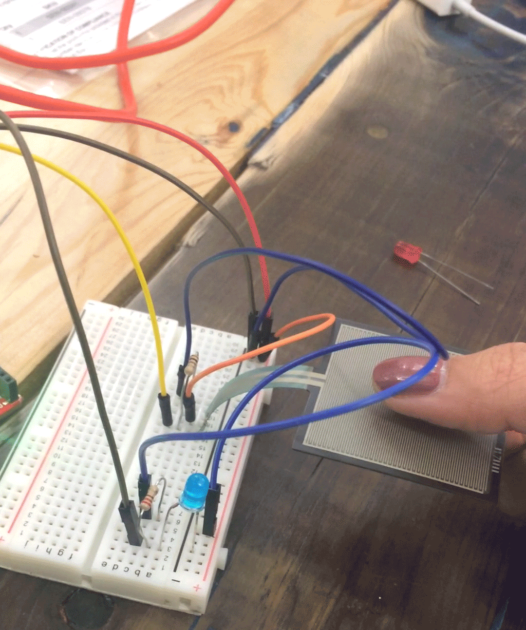 Prototyping for our project fell in two different categories—joy and technology. To observe how people would react to/interact with various joyful scenarios, we set up a puzzle in public spaces with an invitation to join in and a colorfully decorated bench in the middle of a college campus. Technological prototypes varied from creating a fire with a fan, tea lights, and fabric/streamers to experimenting with lights and pressure sensors connected to an Arduino.
